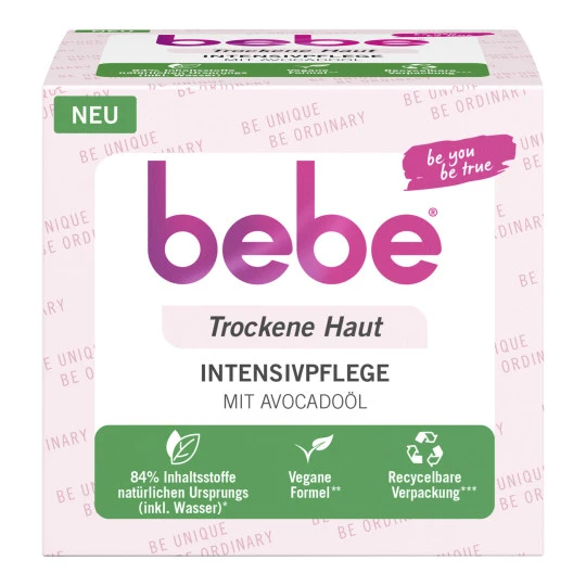 Manchmal stichst du gern aus der Masse heraus, manchmal schwimmst du lieber mit dem Strom? Es muss nicht immer entweder oder sein. Die bebe® Intensivpflege ist eine intensiv pflegende Feuchtigkeitscreme, die speziell auf die Bedürfnisse von trockener Haut abgestimmt ist. Die reichhaltige Formel mit Avocado-Öl und Sheabutter spendet der Haut 24h Feuchtigkeit und hilft ihr, diese zu bewahren. So verwandelt die softe Formel auch trockene Haut in wunderbar geschmeidige und weiche Wohlfühl-Haut. Hautverträglichkeit dermatologisch getestet.